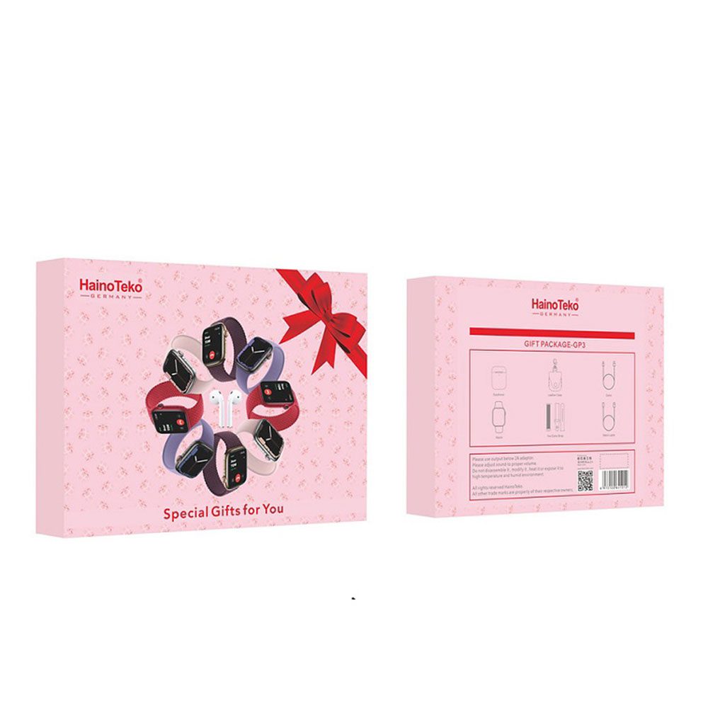 GP3 یک پکیج بسیار شیک از شرکت Hinautco است و می تواند هدیه ای بسیار جذاب برای شخص دیگری باشد. این بسته دارای ساعت مچی بلوتوث و هندزفری با بسته بندی جذاب است. یک کیف هندزفری چرمی و دو بند ساعت سیلیکونی و پارچه ای وجود دارد.