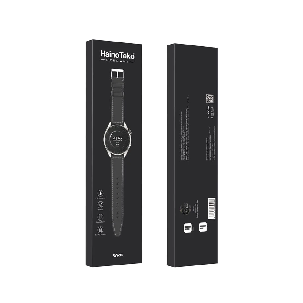 شاسی ساعت دارای اسکلت فلزی است که در دو جا توسط بند به هم متصل می شود. سازنده دو بند مختلف (چرمی و سیلیکونی) را در بسته بندی قرار داده است تا بتوانید با توجه به سلیقه و نیاز خود یکی را انتخاب کنید. ساعت هوشمند Haino Teko RW-33 با وزن 50 گرم یکی از سبک ترین و ارگونومیک ترین ساعت های موجود در بازار به حساب می آید که با ویژگی های خاصی مانند قاب مات، دستبند و سوئیچ های مختلف توجه مخاطبان خواستار را به خود جلب می کند.